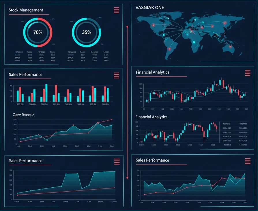 Centralice cada aspecto de su negocio en un solo lugar: desde la gestión de ventas y compras hasta el control preciso de finanzas y stock. Vasniak One elimina los silos de información, ofreciéndole dashboards intuitivos y reportes en tiempo real que consolidan todos sus datos. Esta visión 360° le permite comprender a fondo el rendimiento de su empresa, identificar oportunidades y desafíos, y tomar decisiones rápidas y estratégicas que impulsan su crecimiento con confianza.